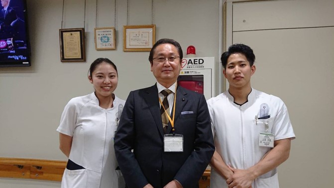 3.14期/上田大貴/医療法人富田浜病院/四日市市にある履正社柔整の実習病院で、病院でトレーナーとしての応急処置の研修に励んでいます。昨年卒業/(池尾校長の左)佐藤も今年AT合格しました。いつも後輩実習生がお世話になっています。