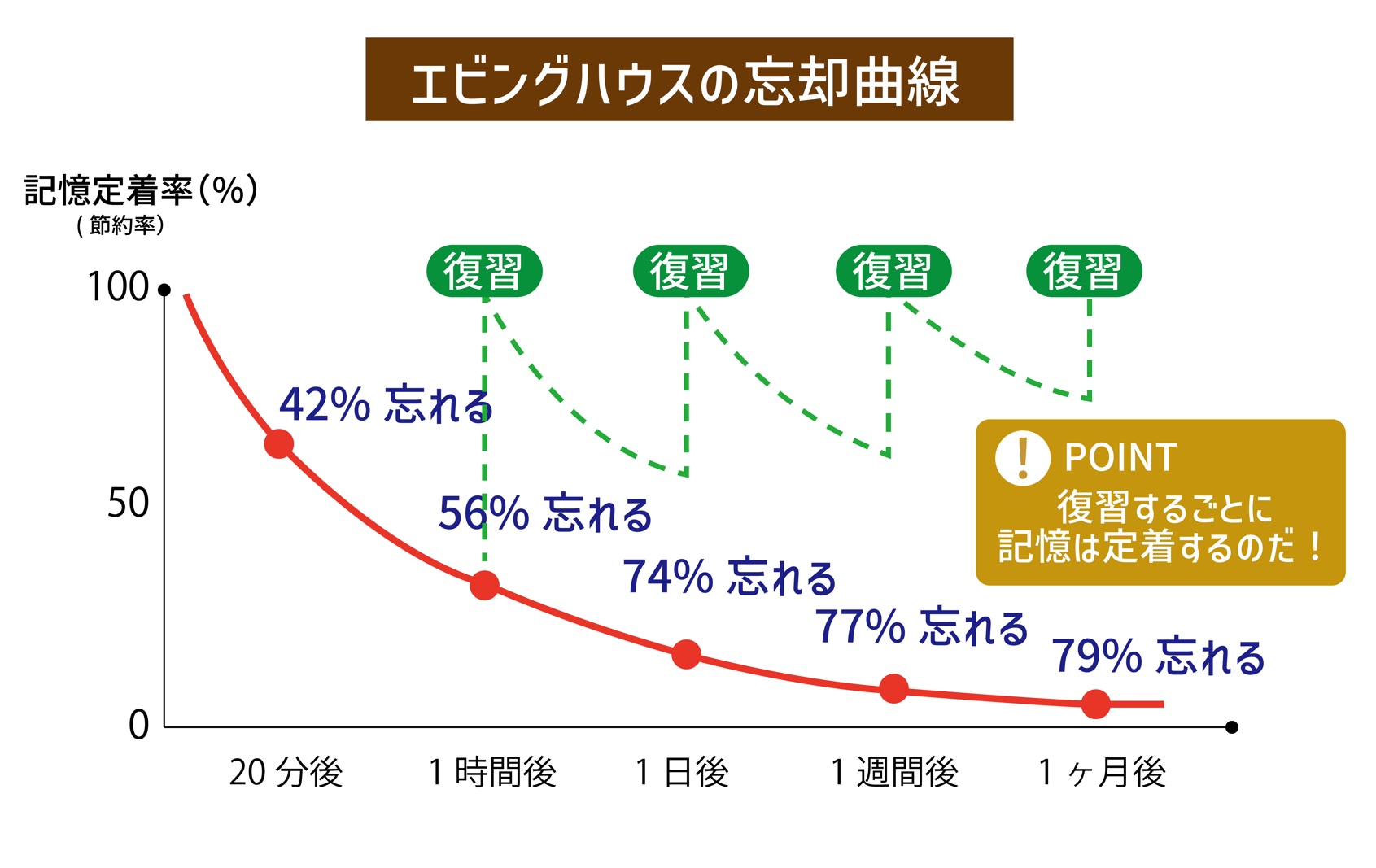 覚えたあと何も復習しなければ忘れてしまう。一夜漬けのテスト勉強で覚えたことは長く記憶に残らないのも頷けますね。