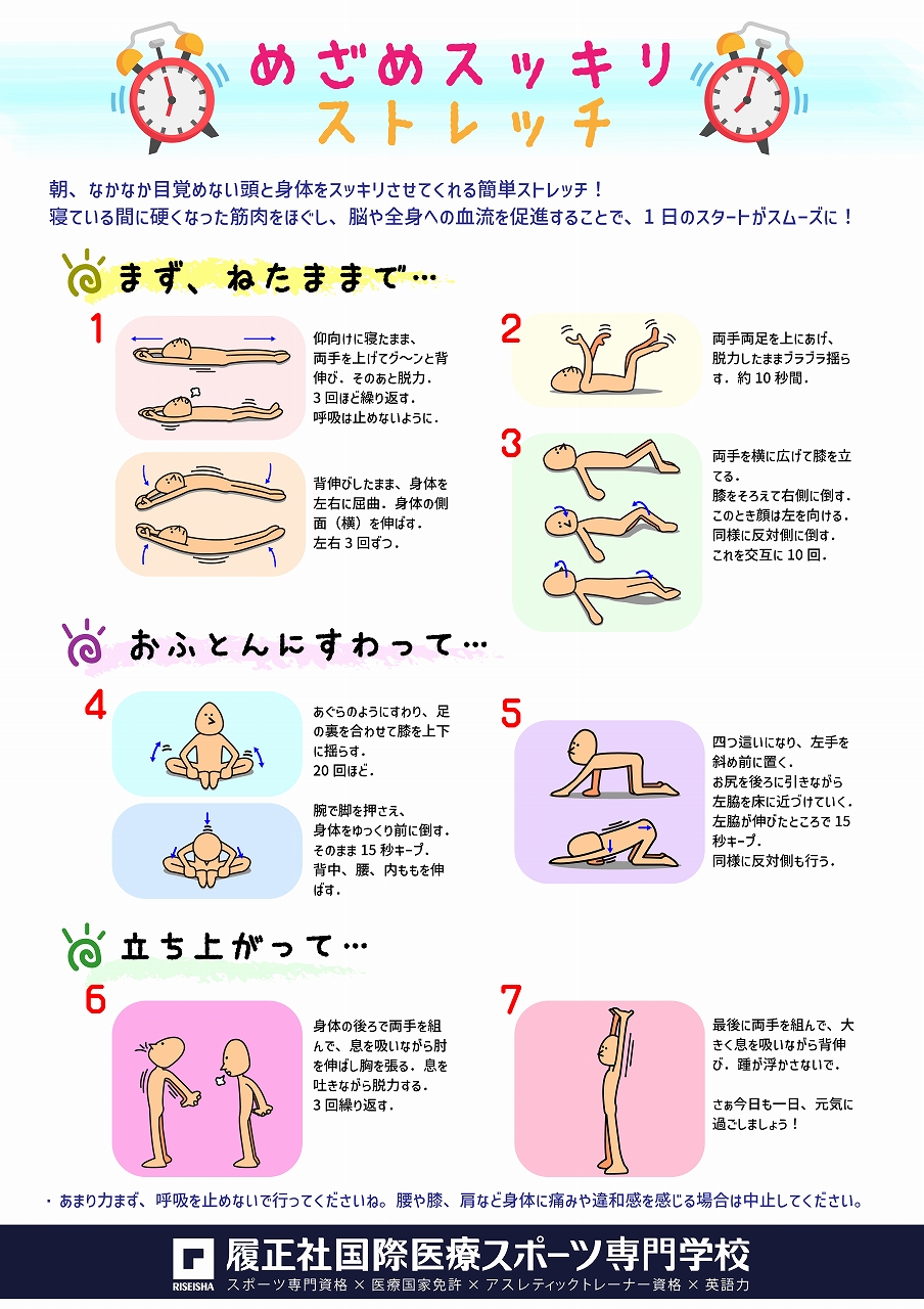 2022.07.06 目覚めストレッチ こんにちは!柔道整復学科教員のアオキです。 「朝、起きるのがつらい…」「もう少しだけ…と思って二度寝して遅刻した」などの経験はありませんか? なかなか目覚めない頭と身体をスッキリさせてくれる簡単なストレッチを紹介します! 寝ている間に硬くなった筋肉をほぐし、脳や全身への血流を促進することで1日のスタートを改善していきましょう。 また、朝から朝日を浴びることは体内時計がリセットされて夜の寝つきも良くなるそうですよ。 さぁ、今日も一日、充実した日を送りましょう! 作画 青木孝至 前の記事 記事一覧 次の記事