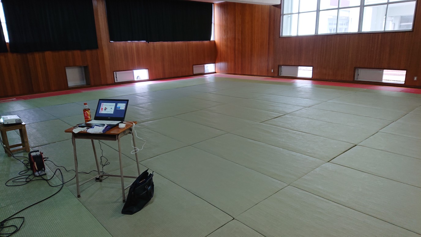 写真にあるのは、5回目となる兵庫県立村岡高等学校(以下、村岡)での出張授業のスライドと、実施した会場(柔道場)です。