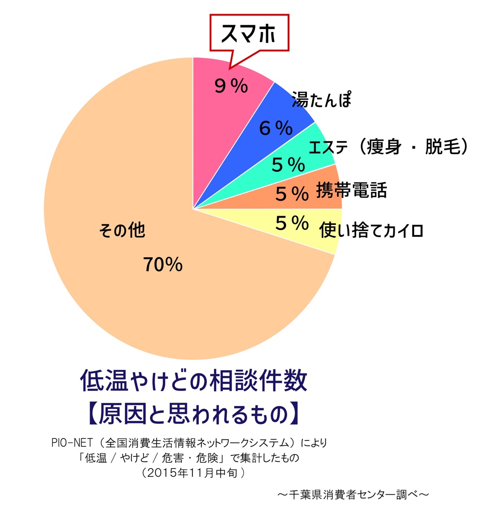 ちなみに千葉県消費者センターの調査によると、低温ヤケドの発症原因の1位は「スマホ」とのこと。湯たんぽや使い捨てカイロより多い。その原因は、寝ている間に充電中のスマホが腕などに押し付けられてヤケドになるのだそうです。