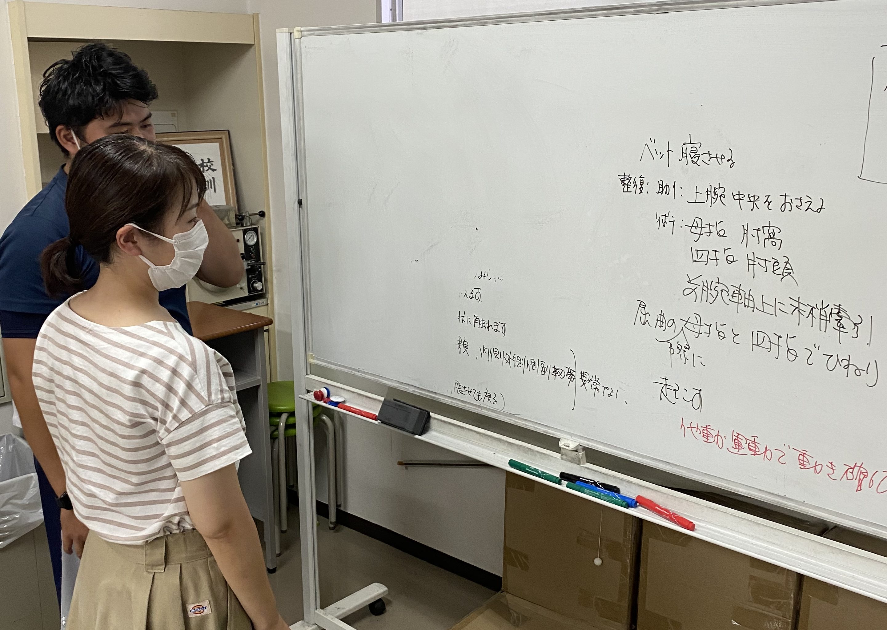 2022.08.19 勉強方法もさまざま 3年生は前期試験期間中ですが、各自の勉強方法は人それぞれです。 教室に行ってみると、2人の学生がホワイトボードを使って、それぞれにアウトプットをしながら勉強していました。 色んな勉強方法を駆使して、試験を乗り越えていこう! 前の記事 記事一覧 次の記事