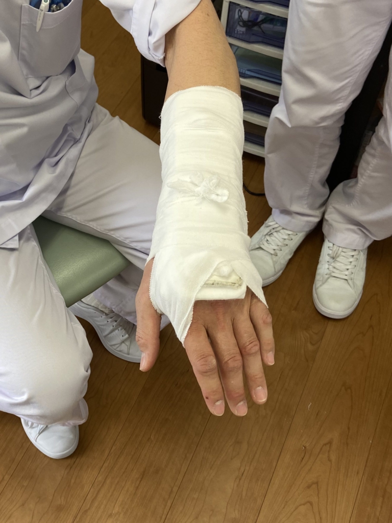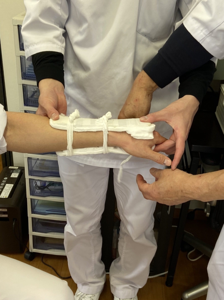 テーマは手首の骨折(橈骨遠位端部骨折、コーレス骨折ともいいます)について、症状の説明や治療の実技(整復動作と固定法)をたっぷりと時間を使って、教えていただきました。