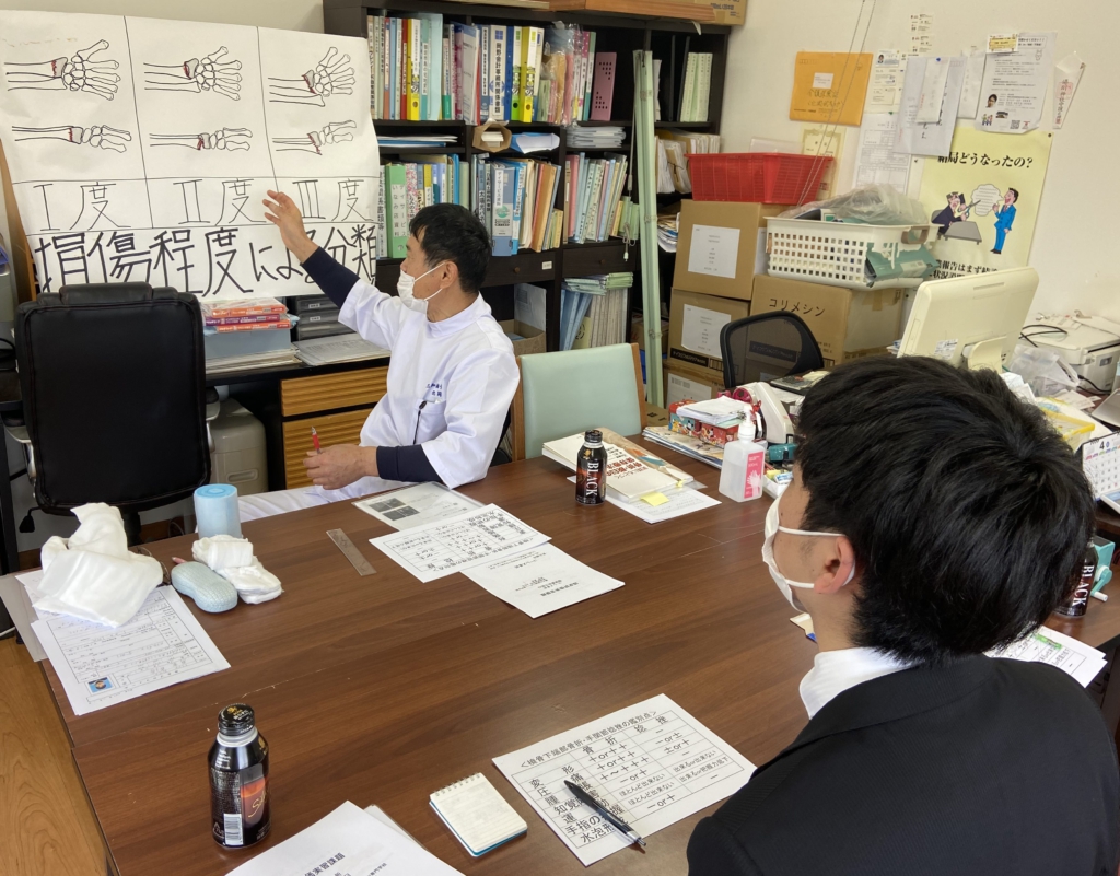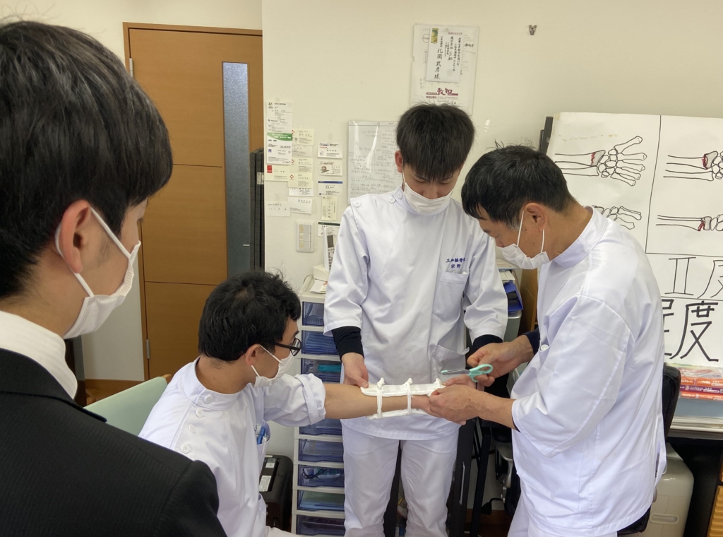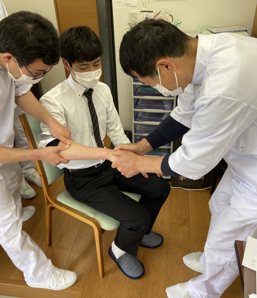 実習生も患者モデルとなり、院長の解説を間近で聞くことができ、メモを取りながら、体験し、教科書では掴めない力の掛け方(押す、引っ張る等)具合が想像よりも力強く、また痛みを感じないことに驚きました、と感想を伝えてくれました。(院長の経験からくる安心感でしょう|)