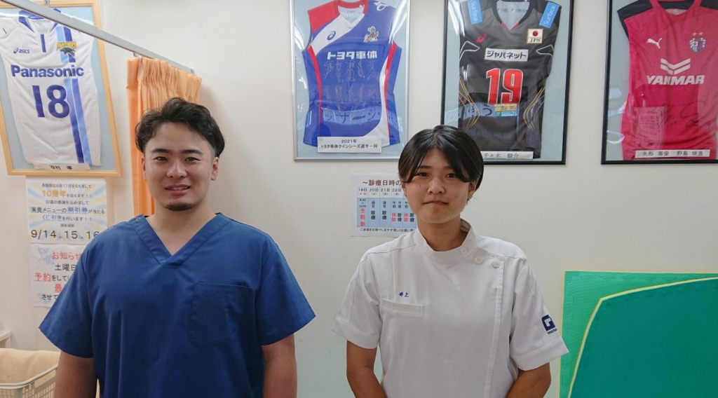 今週の実習で指導をいただいているのは午後部の井上さん。高校時代はソフトボール部に所属し、本校ではAT講座も専攻しているスポーツウーマンだ(履正社柔整17卒川原くんとパチリ)。