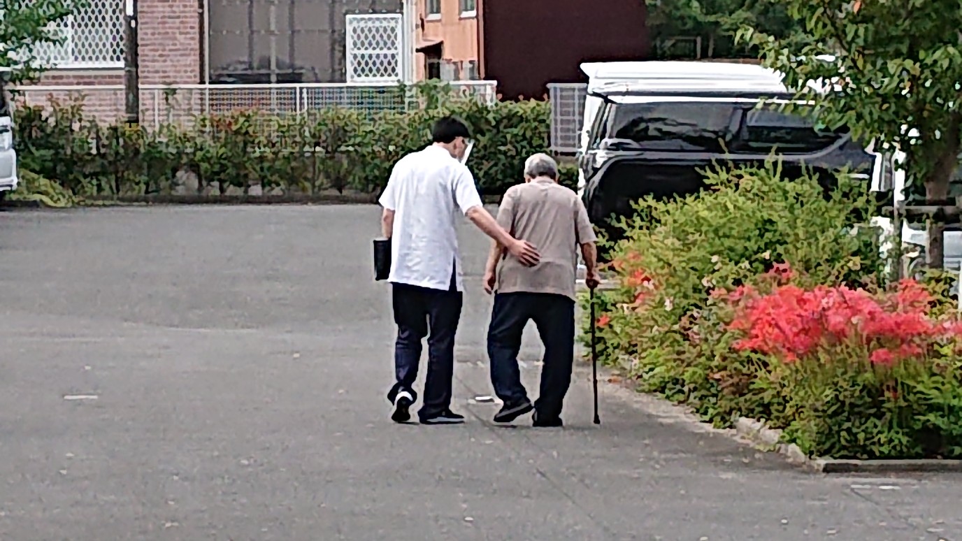 平時から、入院患者さんやデイケアなどで、歩行や日常生活の訓練をリハビリの先生が担当をしていますが、偶然、見かけた患者さんと先生の姿ですが、先生は履正社柔整13期卒の井原君でした。