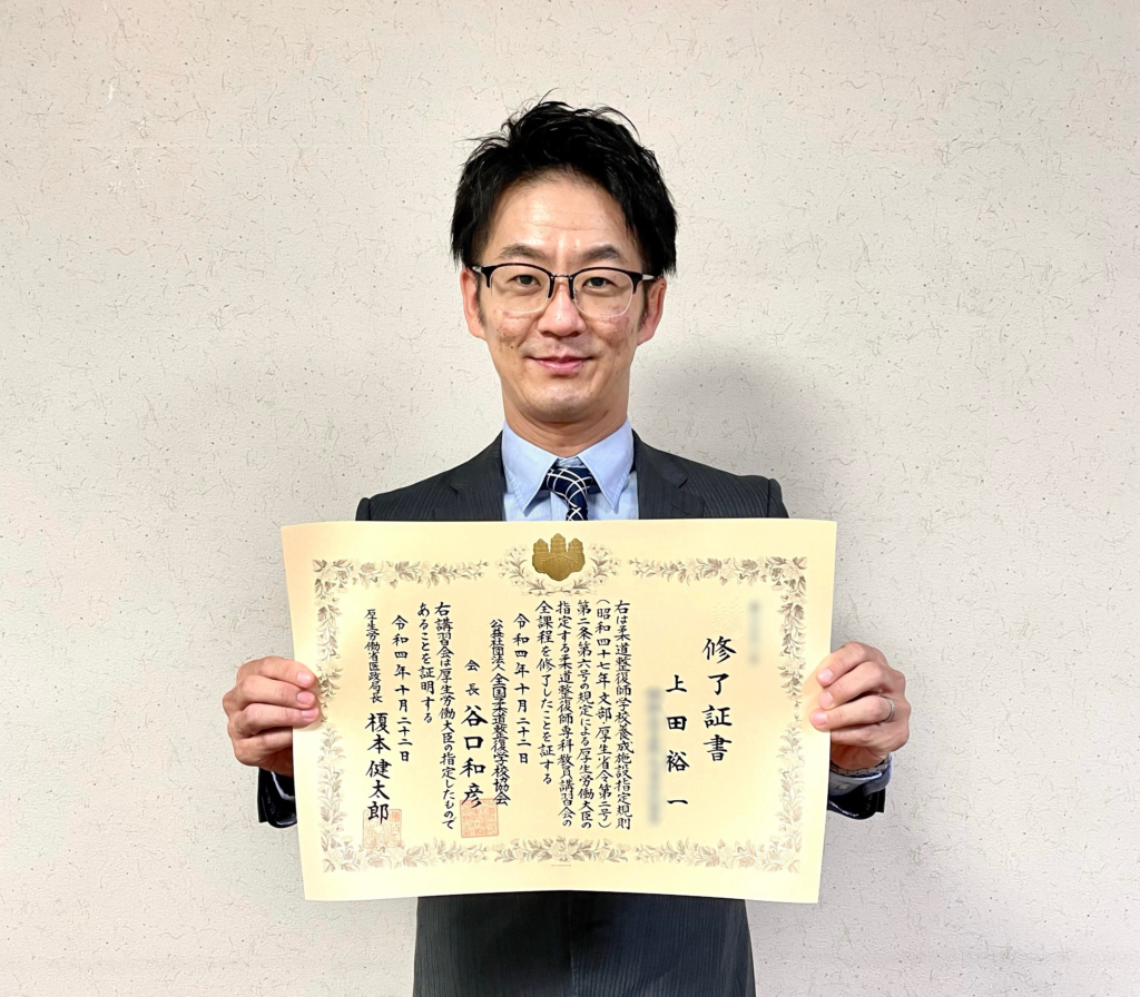 この度、見事に‟専科教員免許(修了証書)”を取得されました。おめでとうございます。