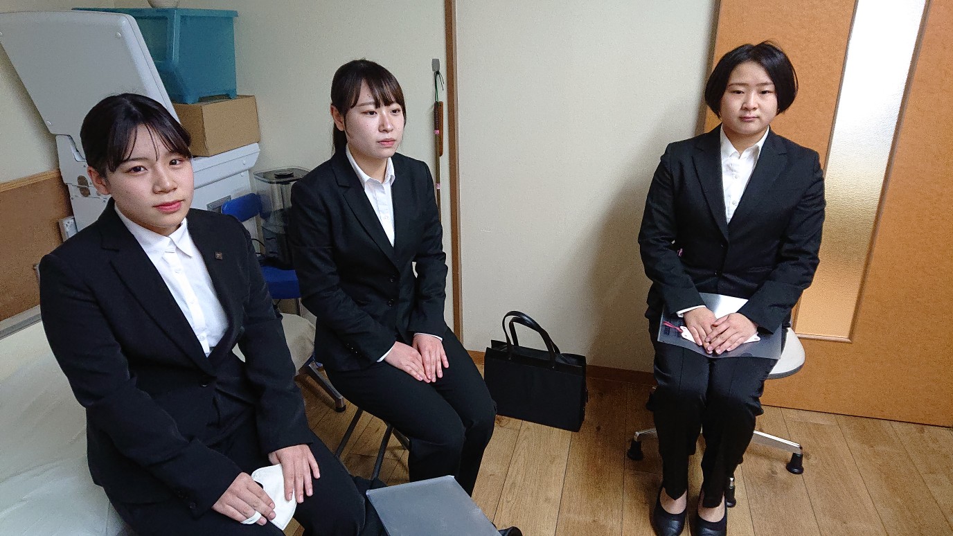 その事前指導会にまず3名の学生が参加し、診察室でやなぎ院長から指導と説明を受けているショット。向かって左から1年の浅畑、山川、一番右が2年の遠藤。