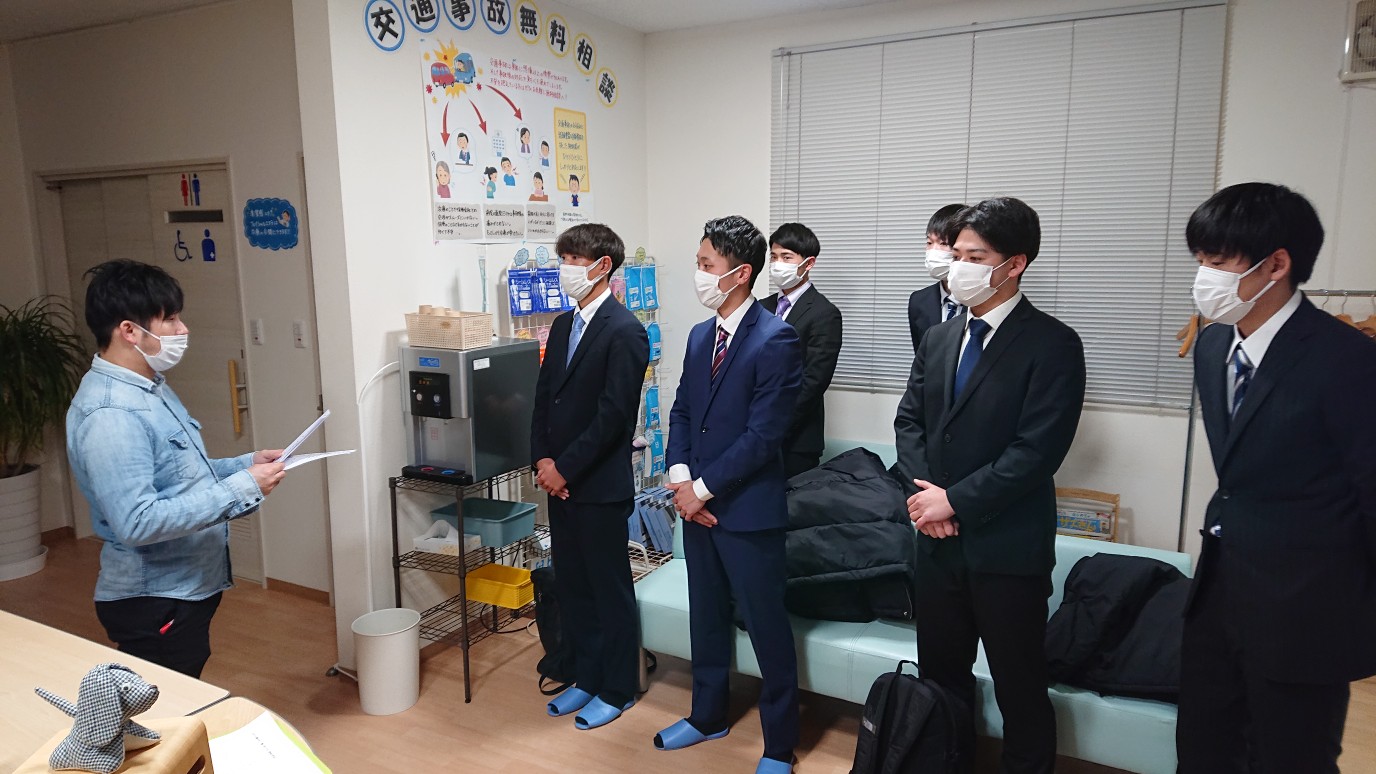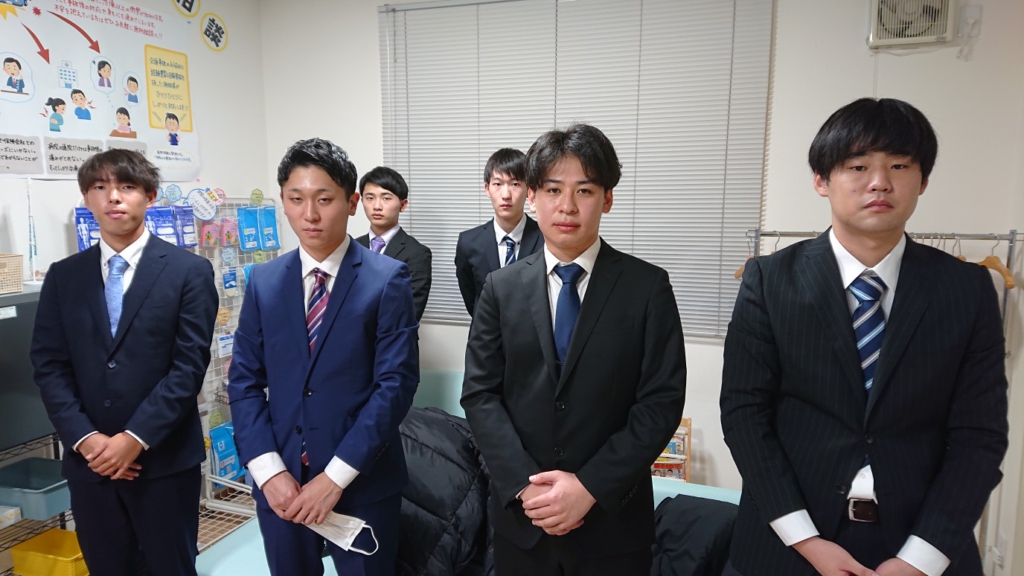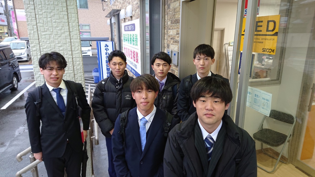 写真にあるのは、実習生の面々。待合室でやや緊張の面構えで、向かって右端から2年野添、魚川、1年堀川、岡山、後列左から藤本、平岩の6名です。