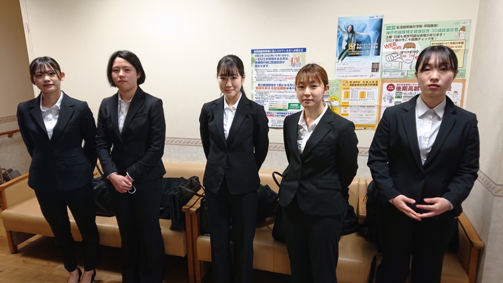 撮影のため、マスクなしのスーツ姿の5名は来週からの実習生、向かって右から2年の勝山、1年の嶽、岩谷、齊藤、真島の5名だ。
