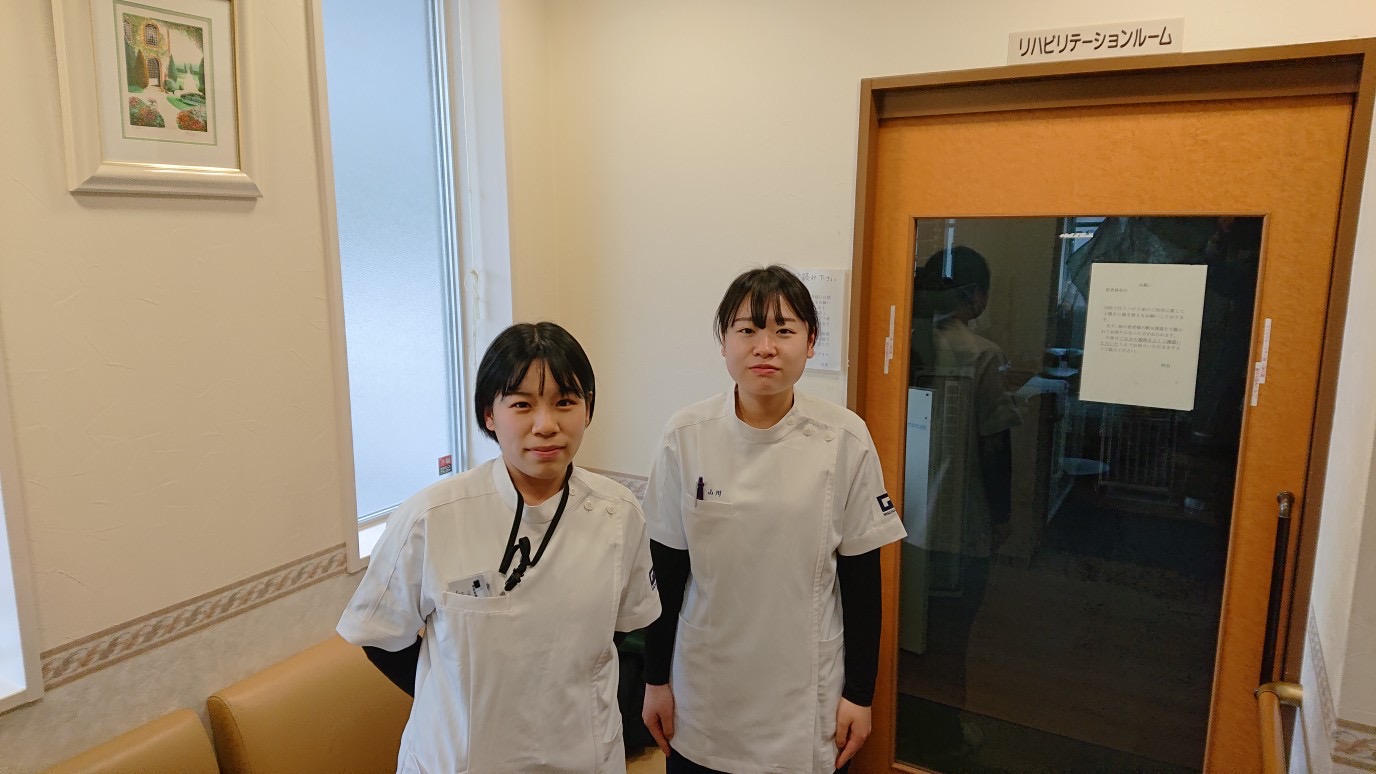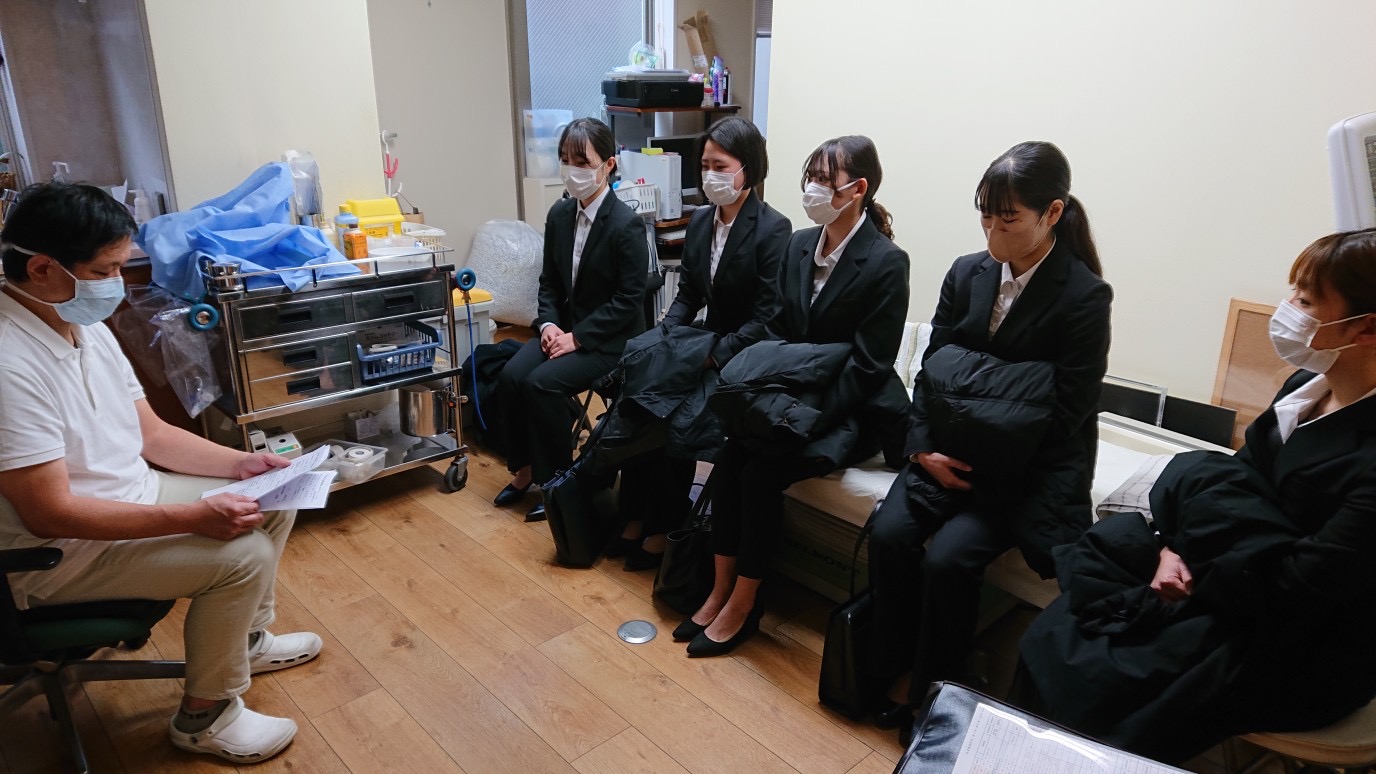 まず白衣を着ている2名の学生は、向かって右から1年の山川と浅畑。やなぎ整形外科での第1週目の実習生だ。