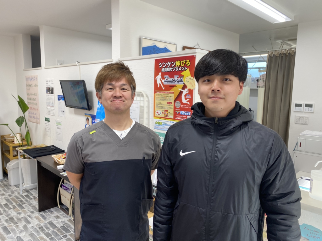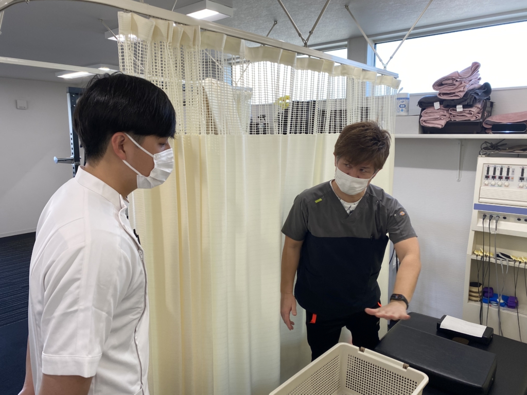 今回の実習生は、玉岡君(3年午後部 北摂つばさ高出身)。玉岡君は、野球部出身ですが、将来はJリーグのトレーナーになりたいとのことで、大分トリニータでトレーナーとして活躍された経験もある山下先生のところで実習を行うことになりました。