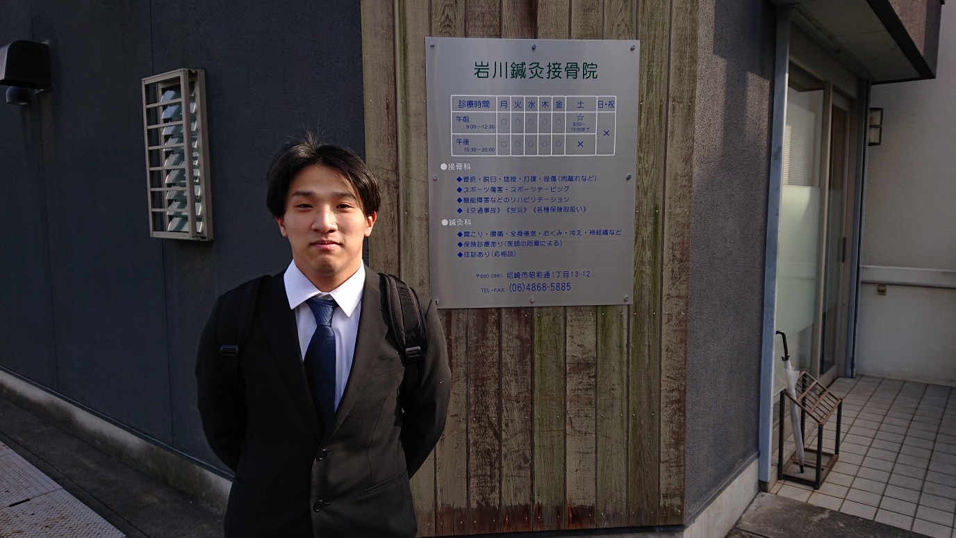 写真にあるのは、尼崎市にある、岩川鍼灸接骨院での実習前現地指導会の様子だ。院長は岩川元一先生、指導を受けているのは2年実習生の梅原君。