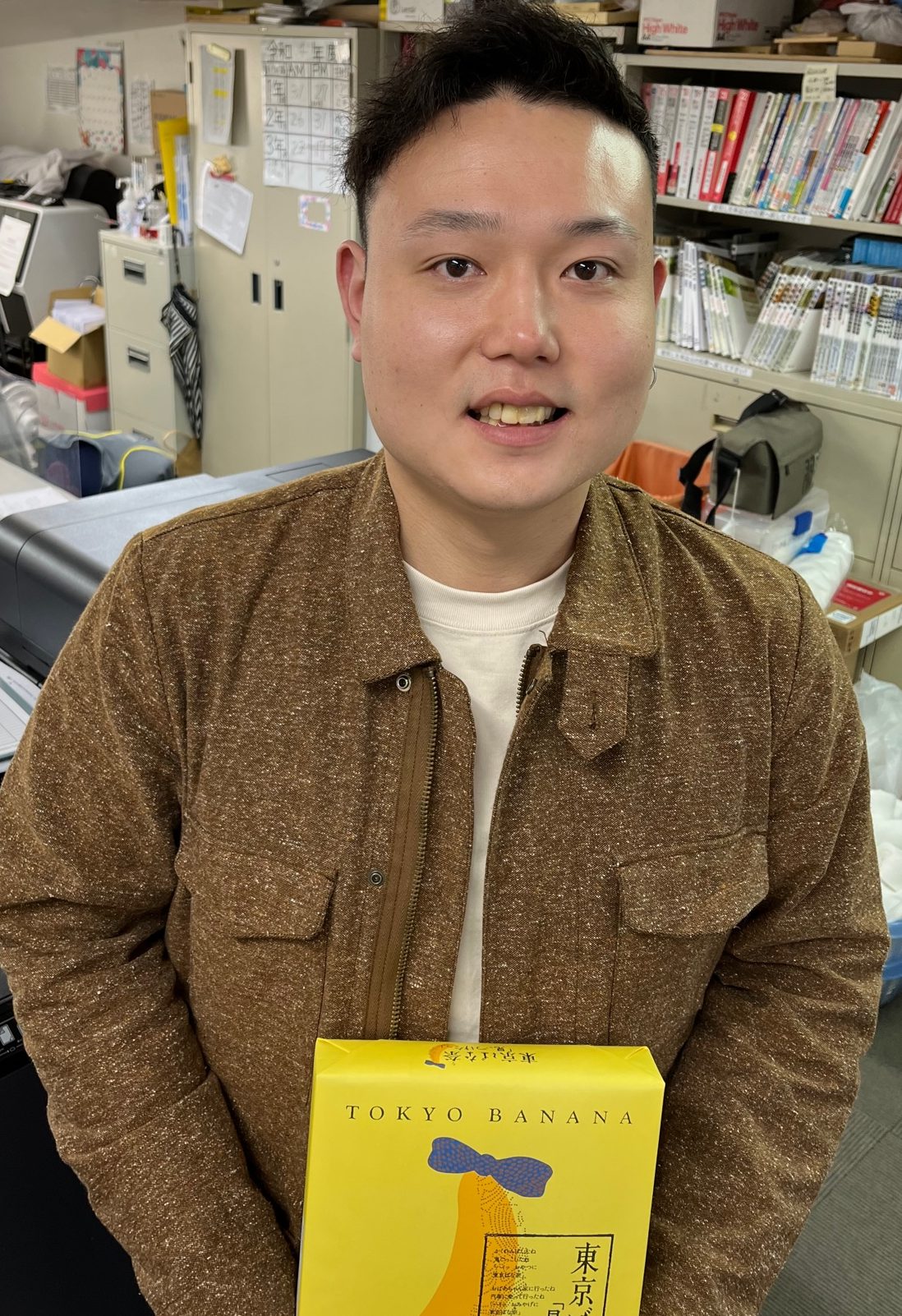 卒業生のYくん(17期生)が勤務先の東京から学校へ顔を見せにくれました。(お土産はもちろん人気ナンバーワンの東京ばな奈!)