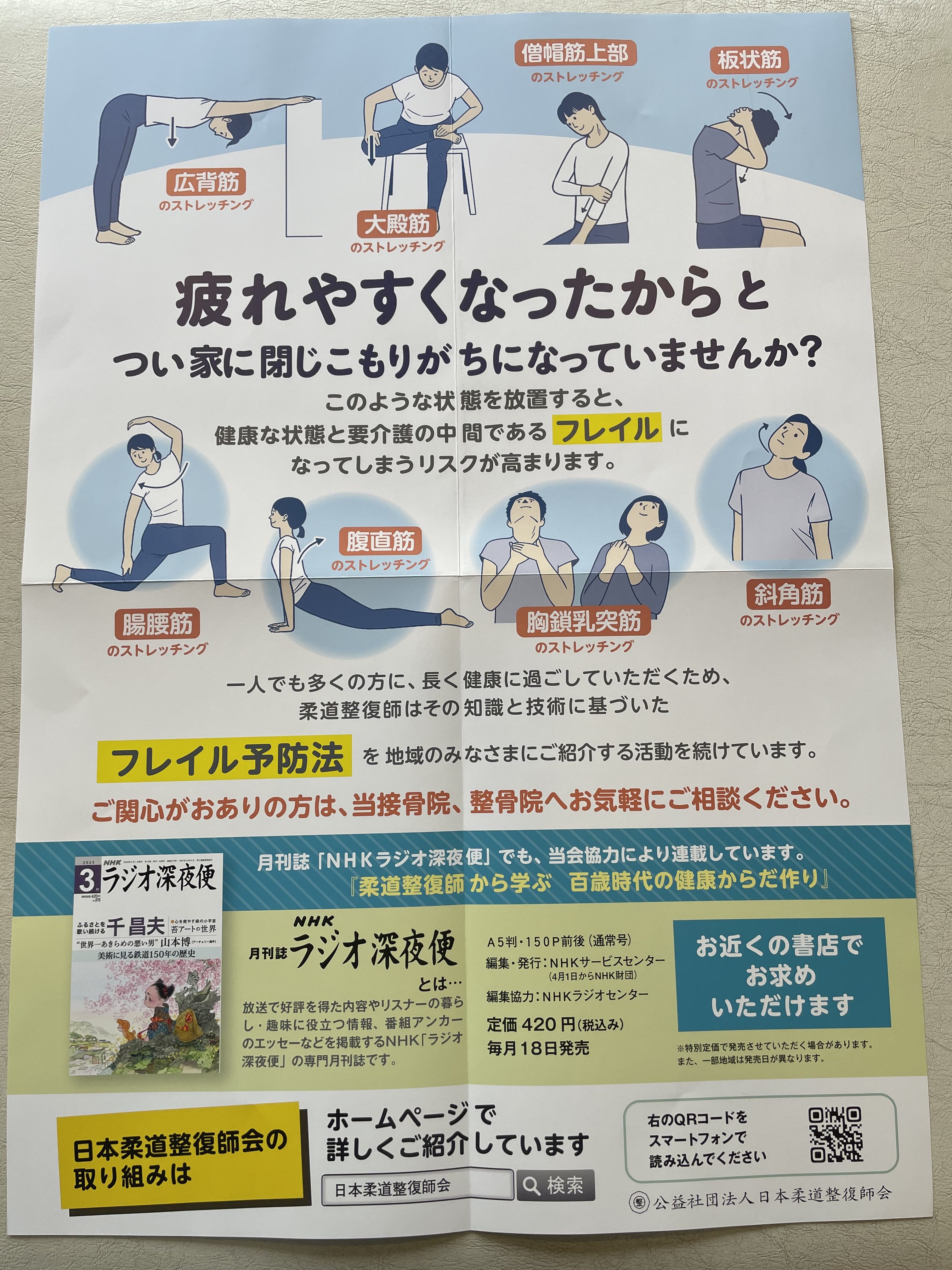 体や心の働き、社会的なつながりが弱くなった状態をフレイルと言います。柔道整復師はその知識と技術に基づいた「フレイル予防法」を地域の方々に紹介をする活動をしています。