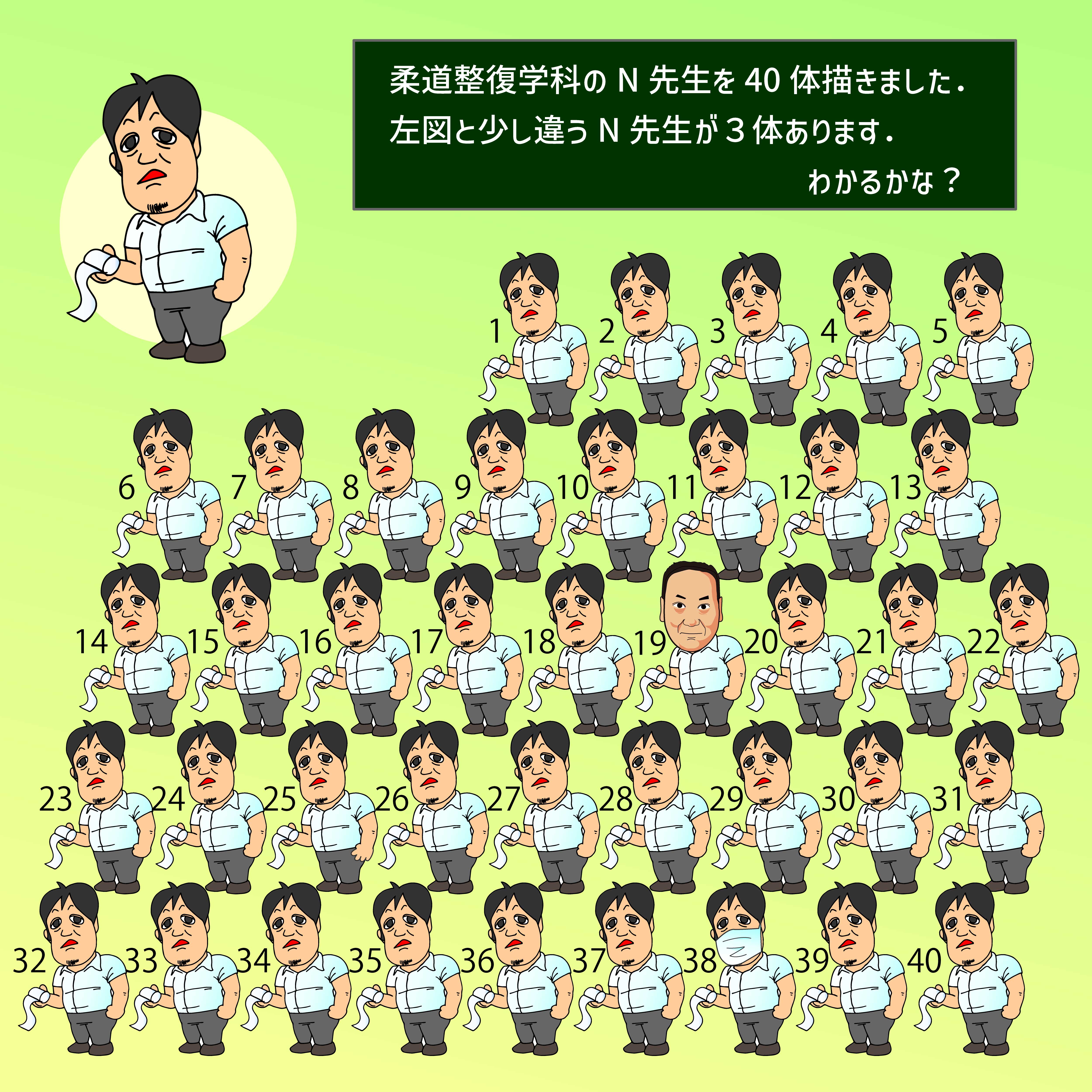 2023.08.09 N先生違い探し こんにちは、柔整科教員のAです。 今日はちょっと息抜き。 柔整科の人気教員・N先生のイラストを40体描きました。 さて、この中に左上のN先生のイラスト(大きいもの)と少し違うイラストが3体あります。 見つけられるかな? ※2つは簡単ですが、1つは難しいかも? 前の記事 記事一覧 次の記事