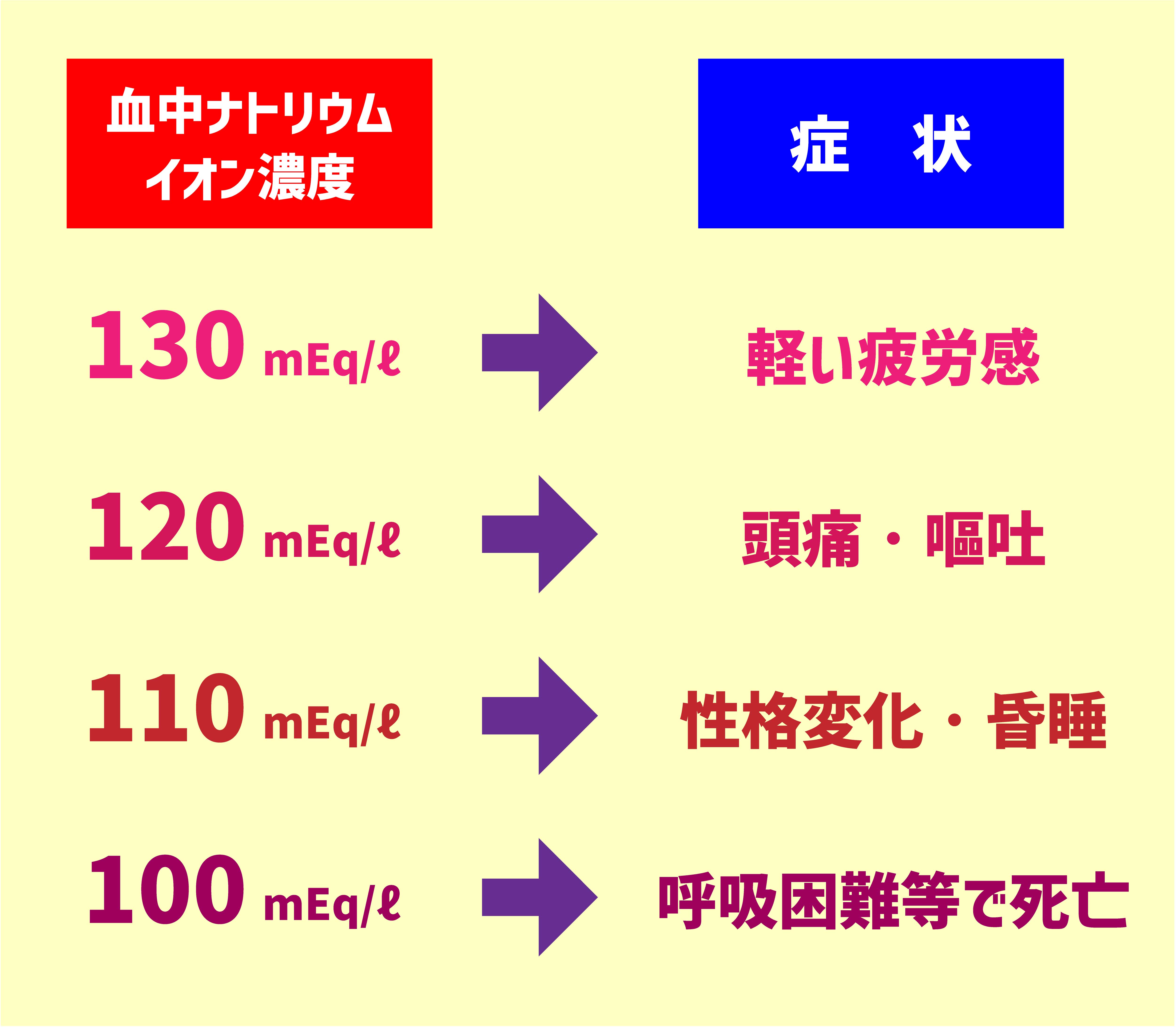 「水中毒」とは、水の過剰摂取によって血液中のナトリウムイオン濃度が低下して起こる症状のこと。