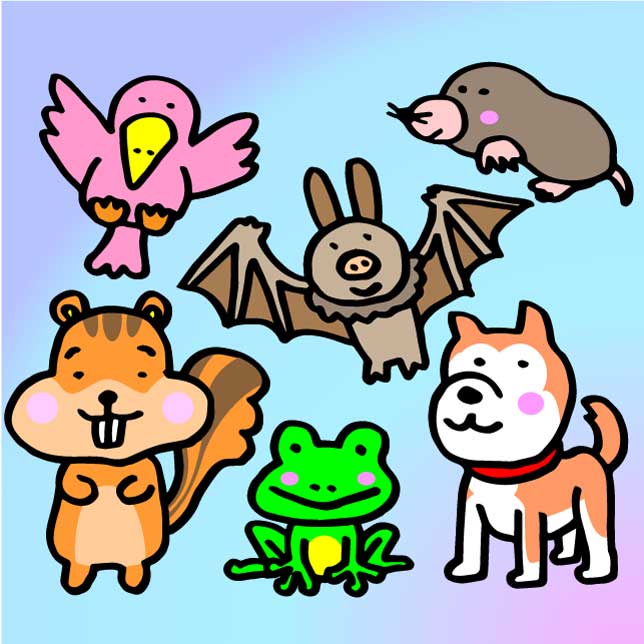 - 鳥 ②モグラ ③コウモリ ④リス ⑤カエル ⑥イヌ