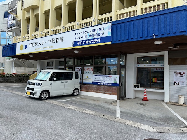 写真にあるのは、宮古島出身の川満君と宜野湾スポーツ接骨院の外観ショット。