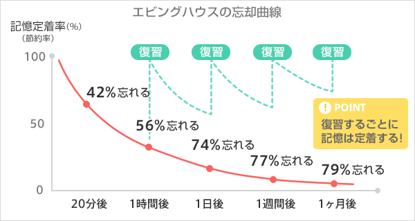 前述の忘却曲線の通り、覚えた内容は繰り返し復習しないと長期的な記憶に定着しません。