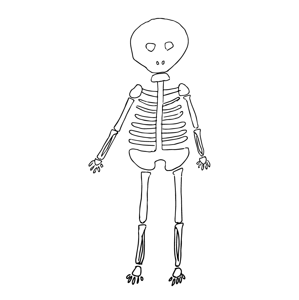 街中に貼っているハロウィンのポスターに描かれているガイコツもけっこうめちゃくちゃな構造をしています。鎖骨がないとか、膝のお皿(膝蓋骨)がないとか、背骨が1本の棒とか、骨盤の形がバラエティに富んでいて、面白いものです。