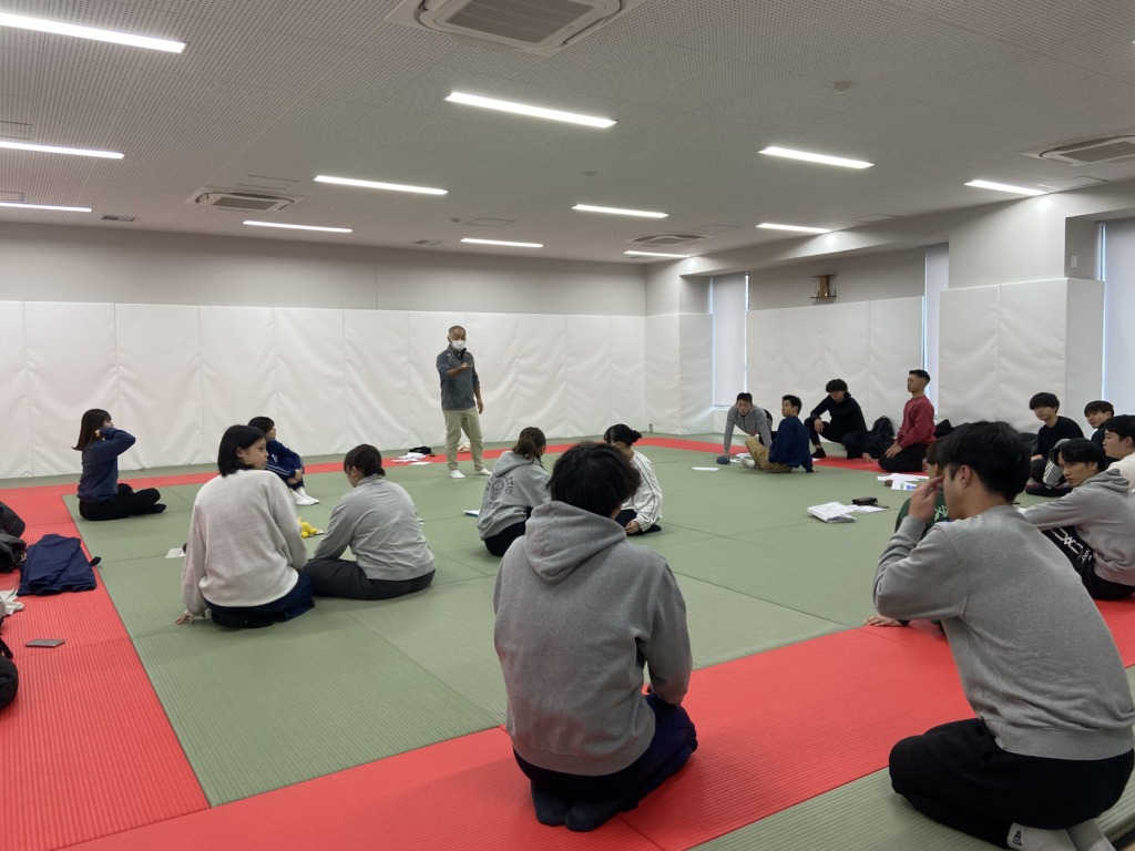 毎週金曜日、1限目が始まる前8:30から約50分、ストレッチや体幹トレーニング、スポーツマッサージなど理論と実技を中心に進めています。
