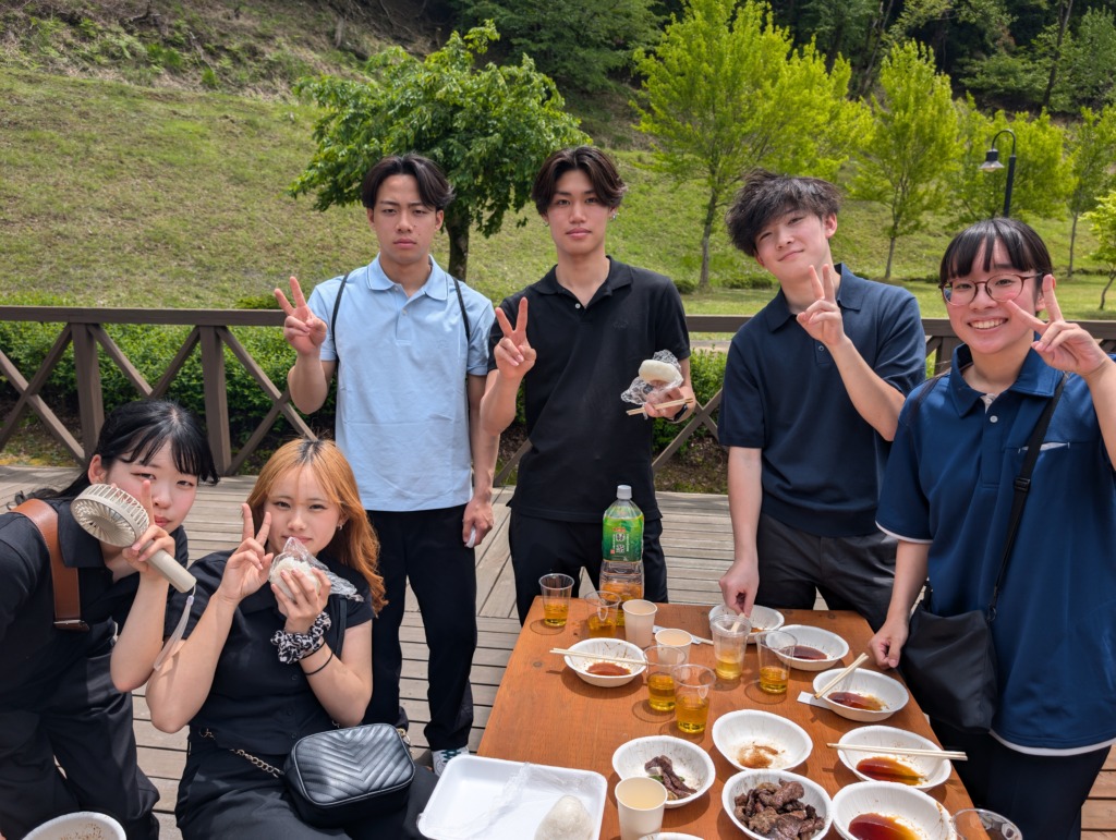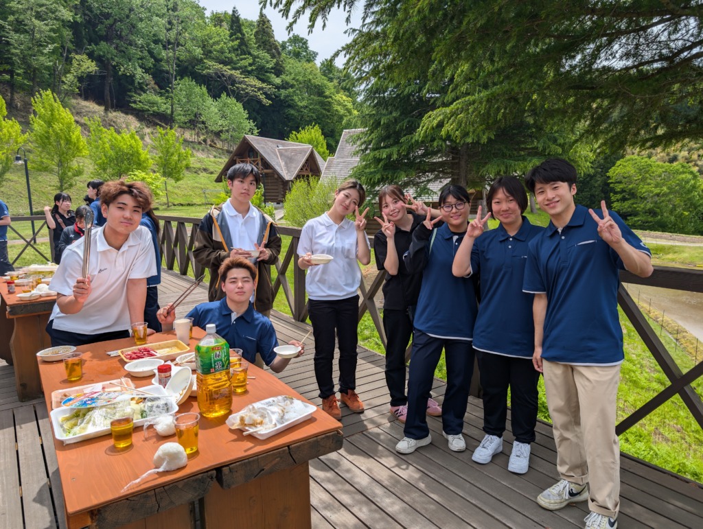 午前部、午後部の混ざった班で交流をしながらBBQを通して、親交を深めた新入生。