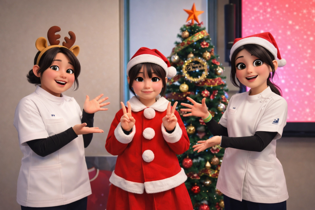 いつもお手伝いに学生が来てくれるのですが、クリスマスということで、可愛い格好をしていただきました。(写真は恥ずかしいのでとクラスメイトが加工してくれました)