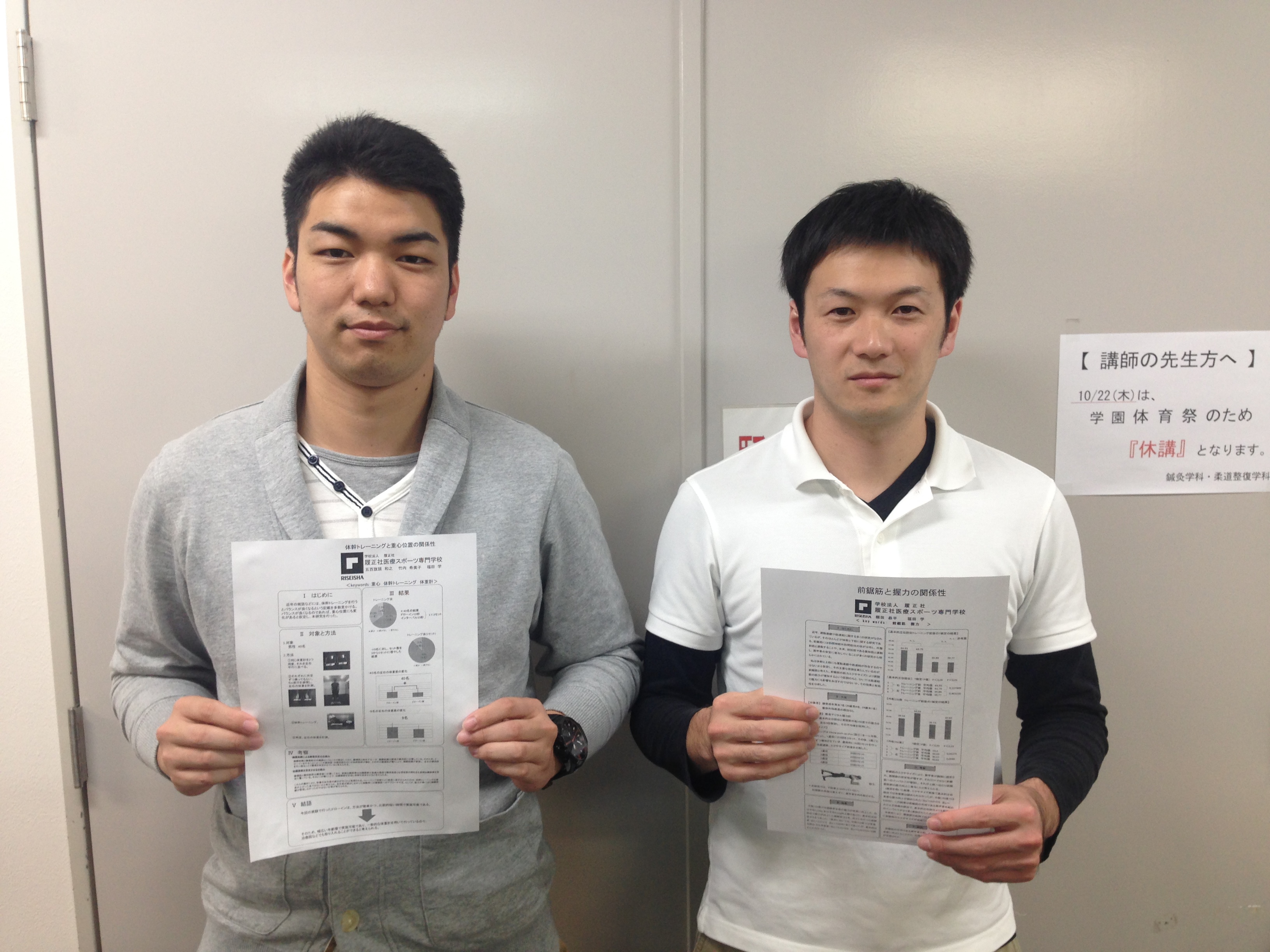 2015.10.21 準備中! こんにちは!教員miです。 3年生は11月7日(土)・8日(日)に開催される、 第24回日本柔道整復接骨医学会学術大会に向けて準備中です! 手に持っているのは発表用ポスターの原稿。 (当日に使う実物は、人の身長より大きいですよ!) この学術大会では、毎年、学生が卒業論文で取り組んだ研究成果を発表しています。 どうすれば見やすいものになるか、どう話せば伝わりやすくなるのか… 考えることばかりですが、良いものが仕上がるよう頑張っています! 11月の発表本番が楽しみですね(^_^) 前の記事 記事一覧 次の記事