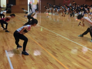 その球技大会の準備運動では、毎年恒例スタジオエクササイズ専攻の学生たちによるウォームアップエアロビクスです![]()