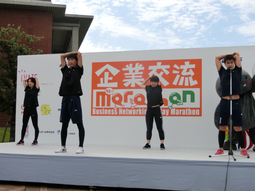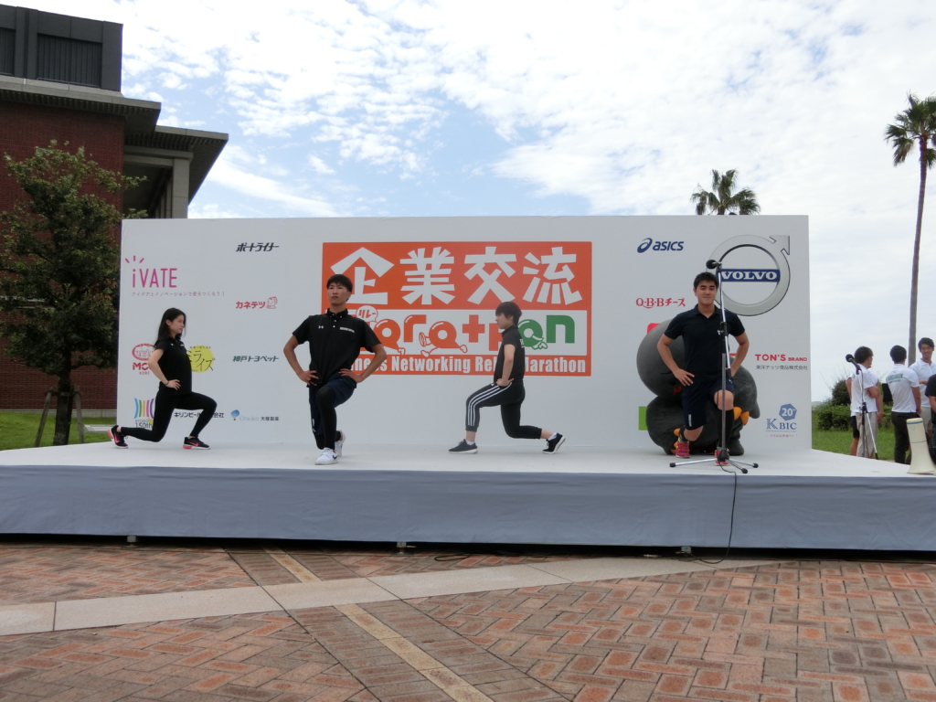 イベントの中には、企業交流リレーマラソン大会があり、本校の学生はその準備運動を担当。
