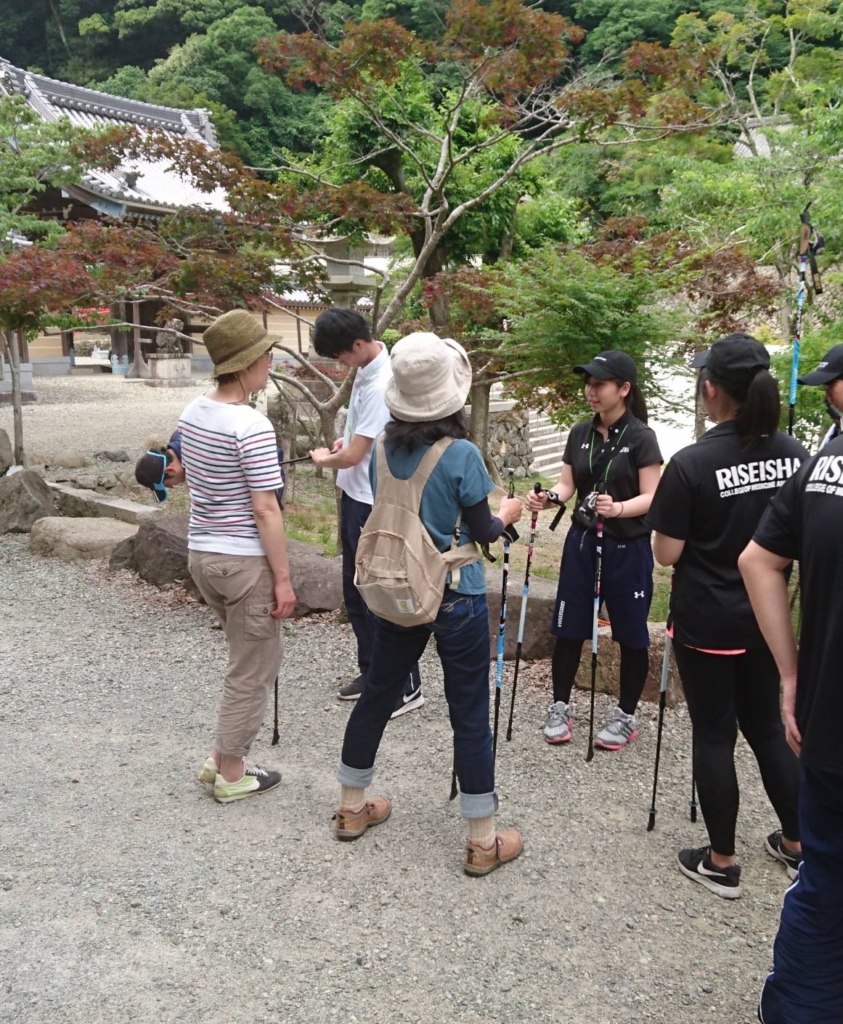 ノルディックウォ―キングの学外実習で高齢者への指導を行う桝田さんです。(写真中央)