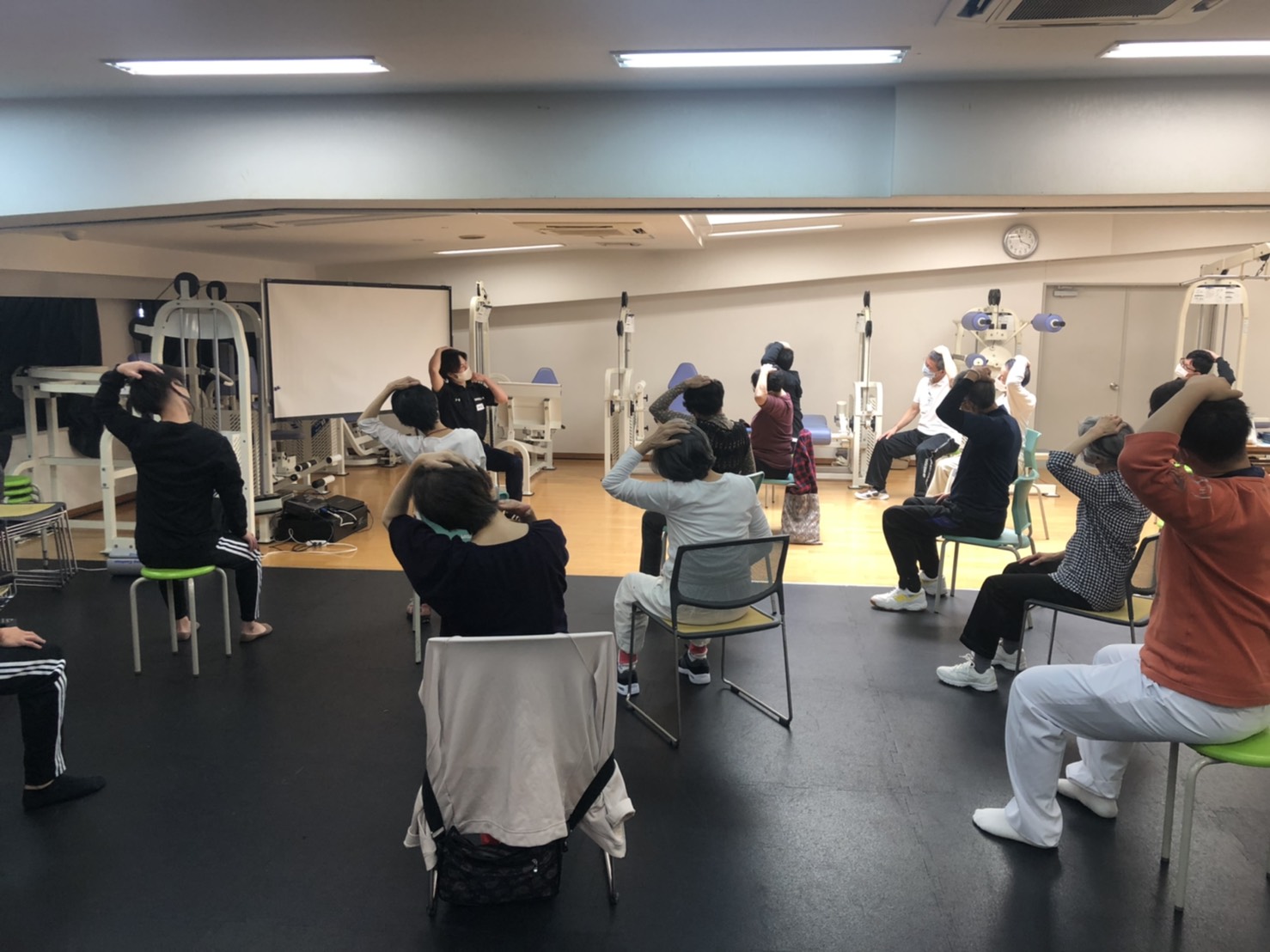 今年はコロナ禍の中、外部での実習が縮小する中、地域貢献のため、大阪市十三にある本校周辺の高齢者の方々を招待し介護予防運動の指導を