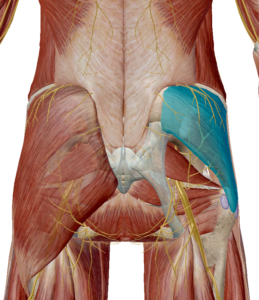 お尻の上部に位置し、直立姿勢や歩行時で骨盤を支える筋肉としてとても重要な働きをしてます。また、股関節の外転動作や外旋動作にも関与します。