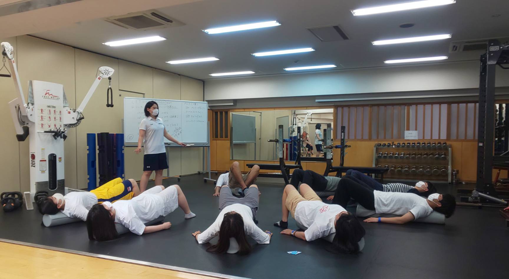 1年次に取得した『PHIピラティス』と『ベーシックインストラクター』の資格を活かし、教員指導のもと毎回10名前後の参加者に約30分のエクササイズプログラムを指導してくれています。