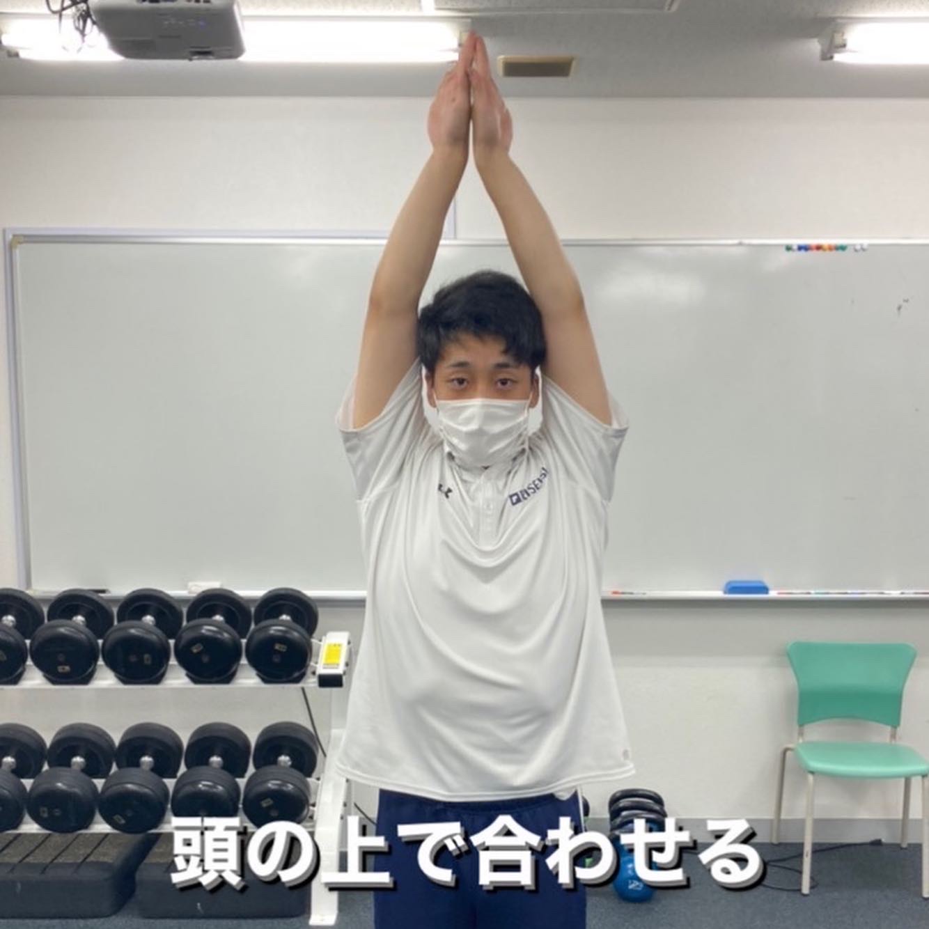 ③腕を頭上に伸ばして手の甲を頭の上で合わせる。