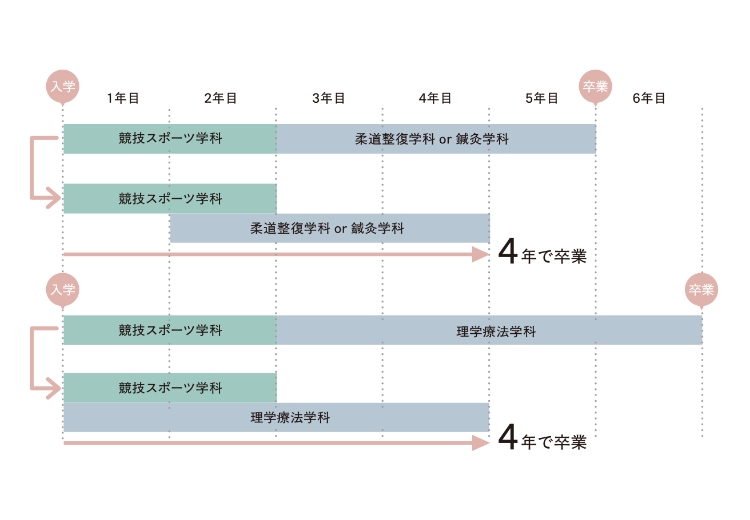 競技スポーツ学科(2年制)と医療系学科(3〜4年制)の合計5〜6年間のカリキュラムを、あわせて4年間で修了できます。スポーツを思う存分続けながら医療国家免許の取得を目指せるため、部活動経験者に人気の「文武両道」ルートです。