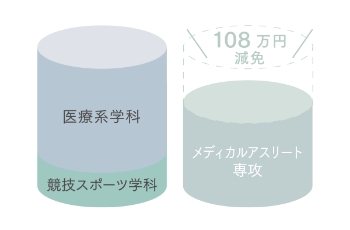 競技スポーツ学科の1年分の授業料と施設設備費をあわせた98万円にプラスして、医療系学科入学金のうち10万円を免除します。