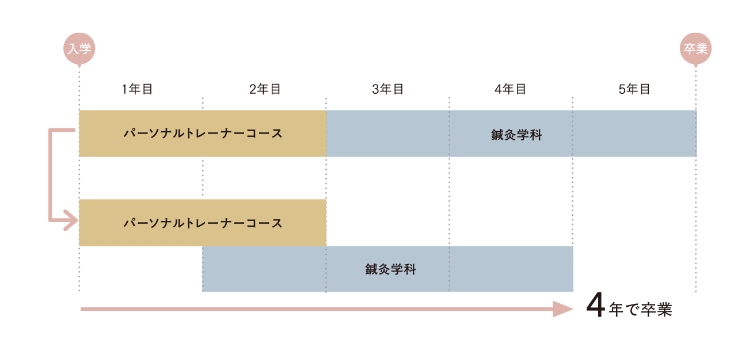 パーソナルトレーナーコース(2年制)と鍼灸学科午後部(3年制)の合計5年間のカリキュラムを、あわせて4年間で修了できます。フィットネス関連の知識、実技を習得しながら鍼灸師の国家免許の取得を目指せます。