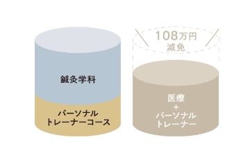 「医療+パーソナルトレーナー」の履修者には、全員に大幅な減免を適用。パーソナルトレーナーコースの1年分の授業料と施設設備費をあわせた98万円にプラスして、鍼灸学科入学金のうち10 万円を免除します。