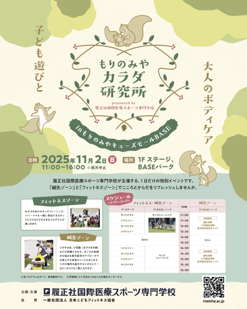 2025.08.20 イベント情報!@もりのみやキューズモール 11月2日、もりのみやキューズモールにてイベントを開催します。 フィットネスゾーンにて、「キッドビクス」や「キッズトレーニング」を学生たちが担当します。 例年多くの子どもたち、ご家族が参加してくださっています。今年も多くの方のご参加お待ちしております。 担当学生たちがどのように仕上げていくのか楽しみだ! 前の記事 記事一覧 次の記事