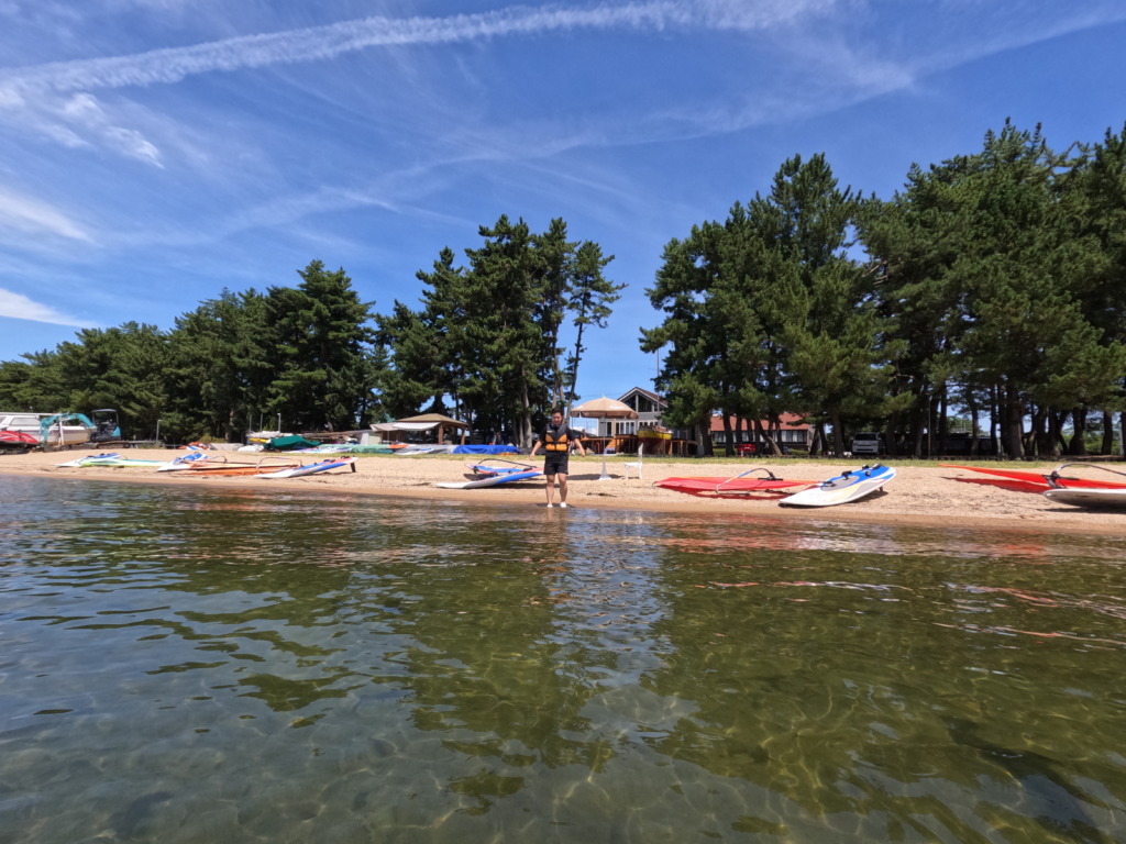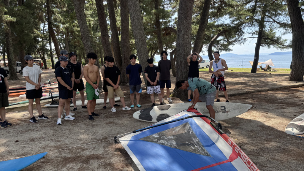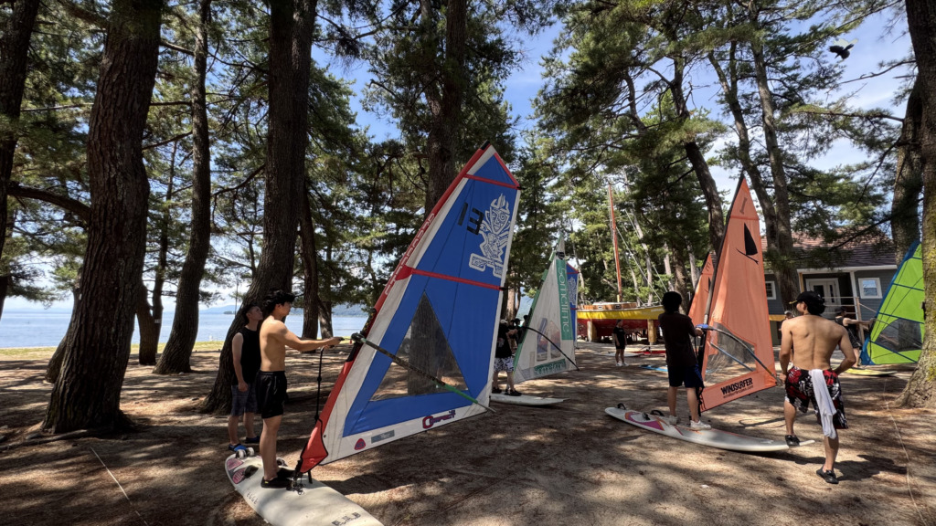 キャンプ実習2日目は、琵琶湖でのウィンドサーフィン体験です。
