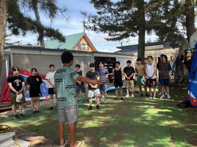 用具の説明や、板への乗り方、風の受け方からマストの持ち方まで、陸上でみっちりと基本練習を行います。