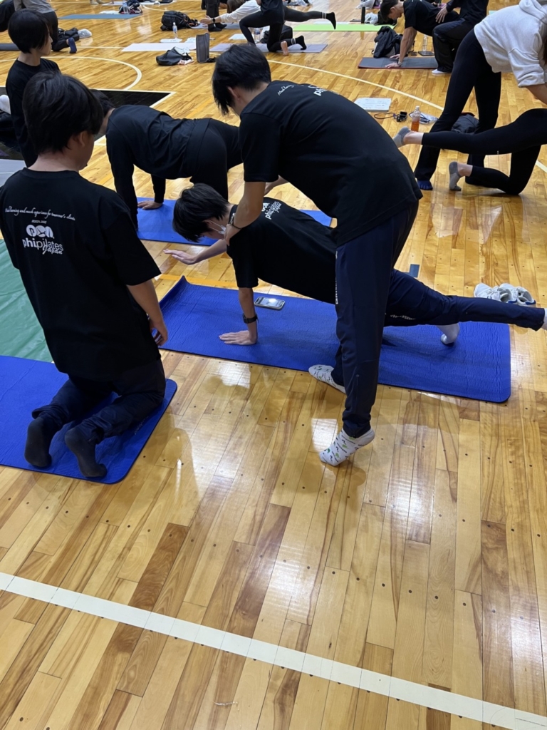 ピラティスが初めての1年生を2年生たちがうまくサポートしながら、実技講習に取り組んでいました。