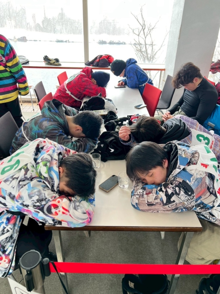 2026.02.27 初日のお昼。力尽きた?? バテてます!笑 夜行バスからの開講式~午前のレッスンを終えた昼休憩の様子。 学生たちもさすがに疲れたようです。 あまり寝れてないし、初めてのスキー/ボードでいっぱい転んだんでしょう。ゲレンデコンディションもあまりよくなかったのもあり、緊張した様子でした。 いつもは元気にはしゃいでる2年生達もさすがにこの様子。 なかなか面白い画が撮れました。 前の記事 記事一覧