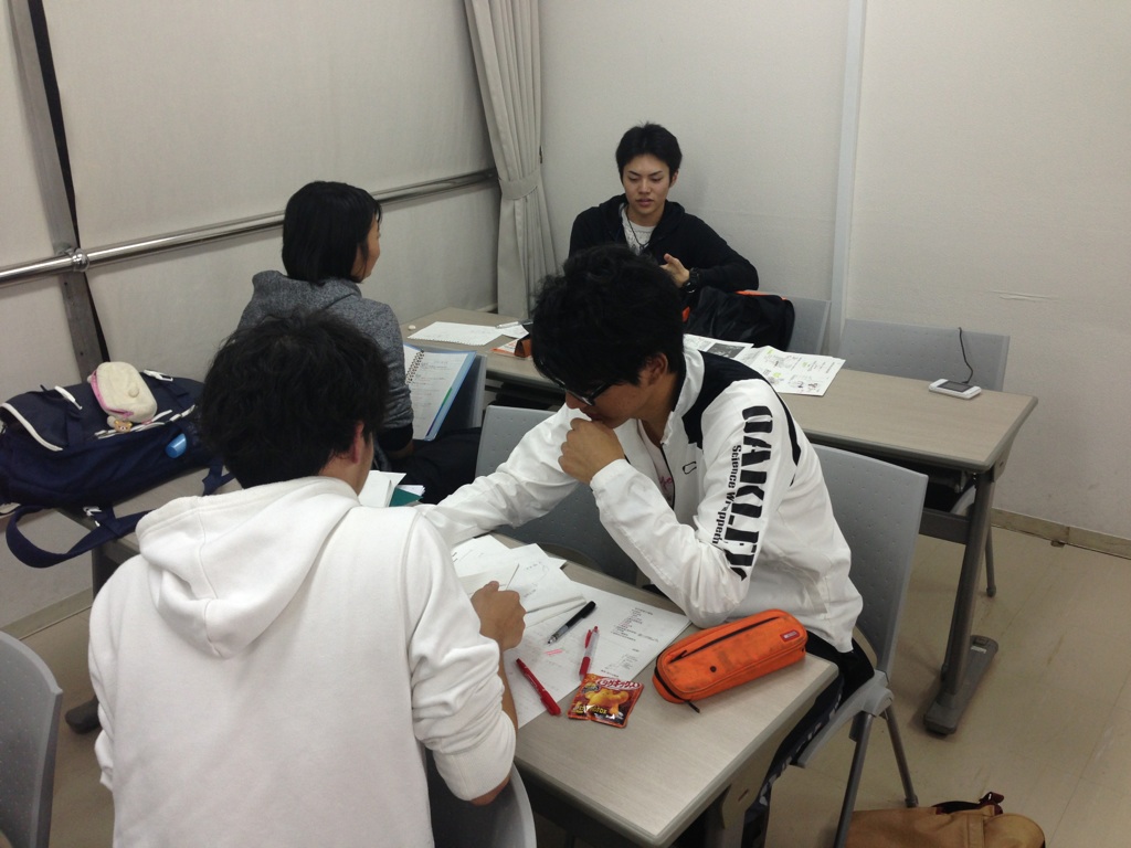 実は前期試験全教科を無事にクリアした“お兄さん”“お姉さん”方がマンツーマンなどで再試験対象者に一生懸命勉強を教えていたのです。