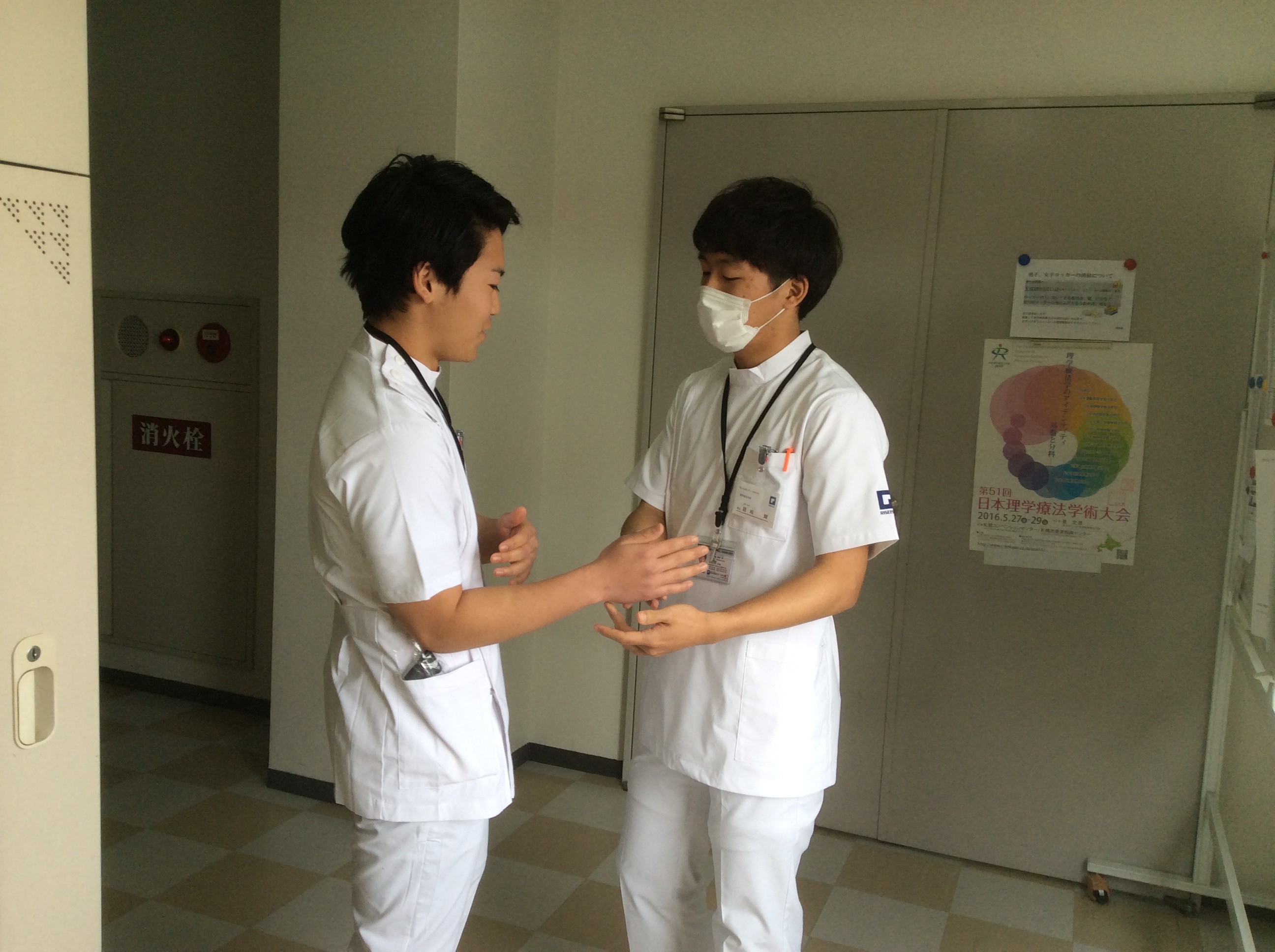 3月に行われる臨床実習で患者さんに対するオリエンテーション(説明)や、検査測定(患者さんの筋力や関節の動きを調べます)が1年生レベルで行えるようになるための実技試験です。