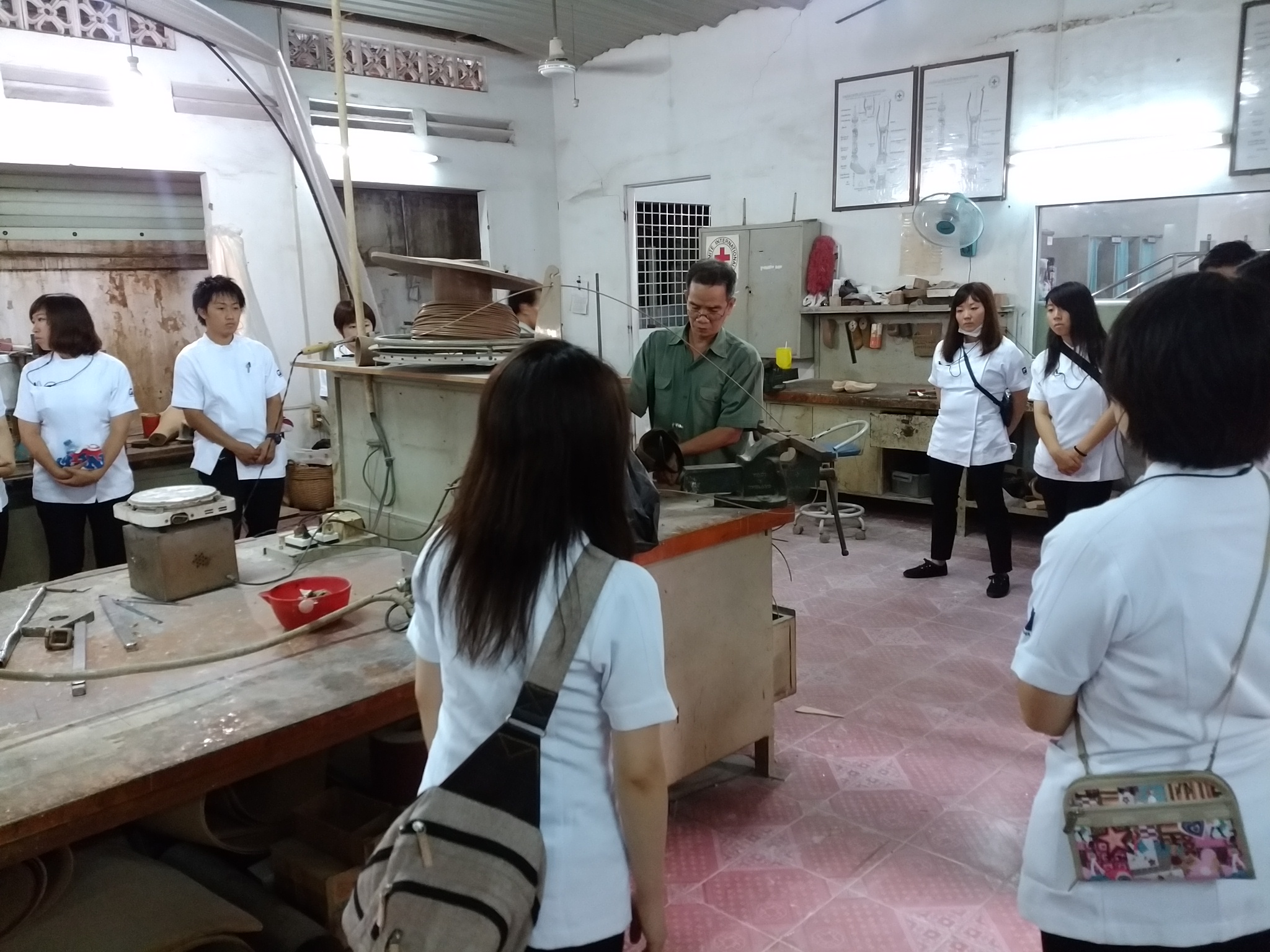 パラフィン浴と足サウナが非常に熱く学生達は驚いた様子でした。5日目はホーチミン市内にある整形外科・機能回復センターで、大腿切断患者様の義足を作製する工程を学習しました。義足でありながら毎日テニスを楽しんでおられる患者様の
