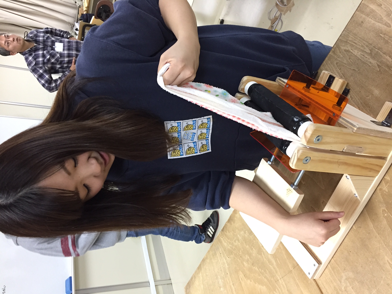 12月のとある日、我が夜間部3年の学生たちは、福祉用具論の授業の一環で、患者さんのための自助具を作製しました。3つの班に分かれて、患者さんの立場にたって、各班それぞれ工夫を凝らして作りました。