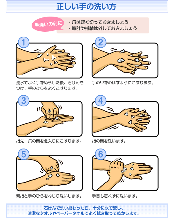 対策としては、主に感染経路を遮断することが有効となります。特に普段いろいろな物に触れている手指においては、充分な洗浄が出来ていないケースも多いので、ウイルスの体内侵入を防ぐためにも正しく手洗いすることを推奨します。以下に、方法を提示したので参考にしてください。